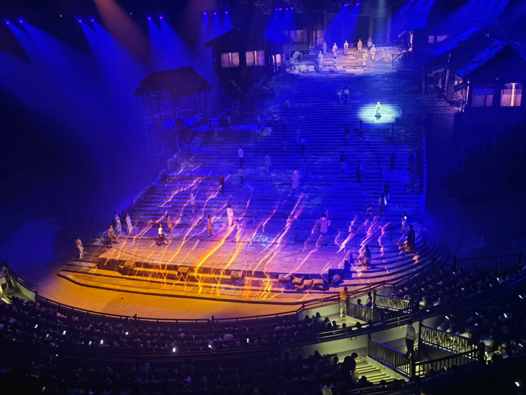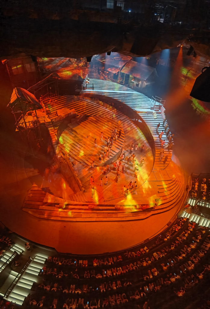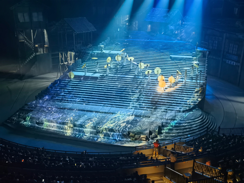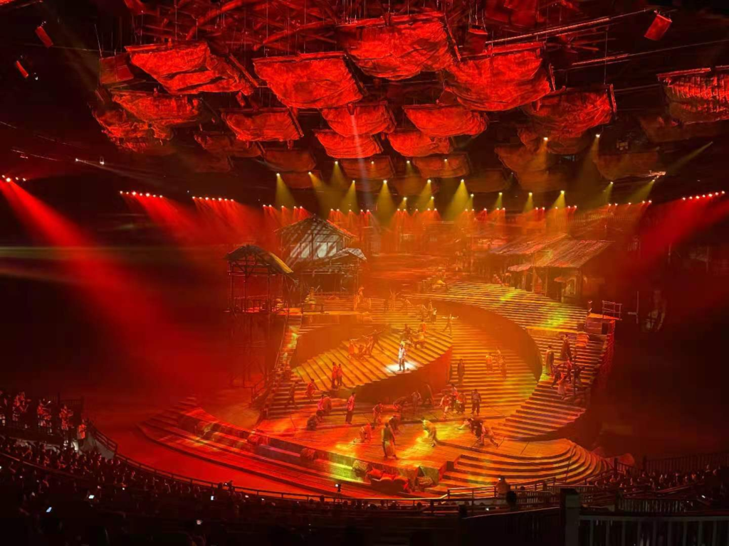 “重庆·1949大剧院”是为《重庆·1949》剧目量身定制的大型非标实景式剧院,总建筑面积达2.5万平方米,是目前世界上最大的单一室内动态沉浸式表演剧场。其颠覆性创新,向观众呈现了前所未见的多维立体沉浸式室内动态舞台。整个舞台由5个可360度旋转的圆环组成,其中1、2、3环为核心表演及布景区域,4、5环既是舞台也是观众席,演艺空间与观演空间交相穿插,随着剧情的发展而不断变换视角位置,使观众与演出完全融为一体,从而营造出身临其境、如梦如幻的独特观演场景体验。