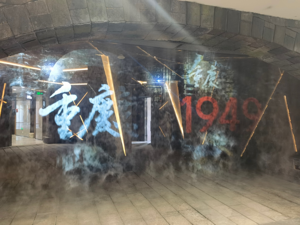 在观众入口处,6台NEC高端激光工程液晶投影机PA703UL+(7000流明、WUXGA分辨率)分别通过雾幕投影和地面投影的方式对实景剧海报内容予以创意展现,吸引观众眼球。其中4台PA703UL+通过两两融合的方式,创新性地打造了两块雾屏,带给观众亦真亦幻的立体视觉享受。当观众穿越雾屏进场时,仿佛跨越时空,穿越回了那座黎明前的“山城”,去领略那段满含悲壮而又令人肃然起敬的历史。PA703UL+拥有REC.2020广色域,令雾屏的色彩表现绚丽多彩;2500000:1的超高对比度,使得画面层次感更强烈,视觉感受更具冲击力和立体感。