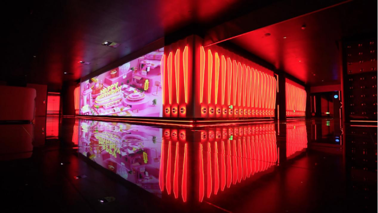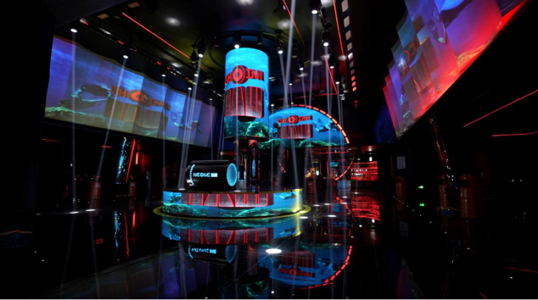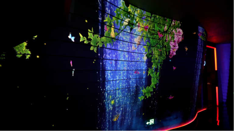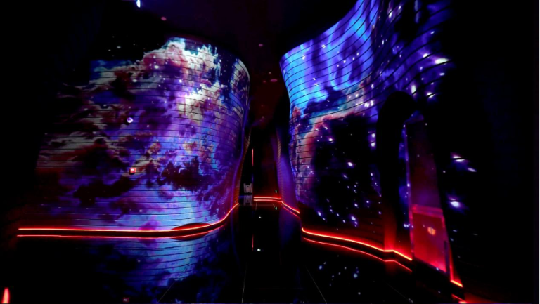 踏上浙皖汇这艘娱乐“航母”,超现实沉浸空间感被放大到极致。七层建筑近百台NEC投影机的巧妙设计,光影变幻中,天与地浑然一体。依托NEC骑士系列激光短焦投影机超强的视觉表现力,浙皖汇地下一层打造为全景式峡谷空间,绚丽光影吸引着每位客人的视线,绵长流线型的墙面设计配合着骑士系列丰富细腻、色彩明艳的投影画面,如同步入迷宫视界,探寻光的方向。每层的走廊设计亦延续如此,蜿蜒曲折的步道引领客人或走入森林,或漫步太空。在NEC骑士系列出色的多机融合性能与色彩表现力加持下,将奇丽山谷或神秘寰宇的景象精准还原,逼真的巨幅影像让人一眼入戏,即刻融入到放肆嗨玩的娱乐氛围之中。眼前尽是华丽景象,双耳溢满动感音乐,烦恼与忧愁不被允许,只有尽情快乐才是唯一正解。